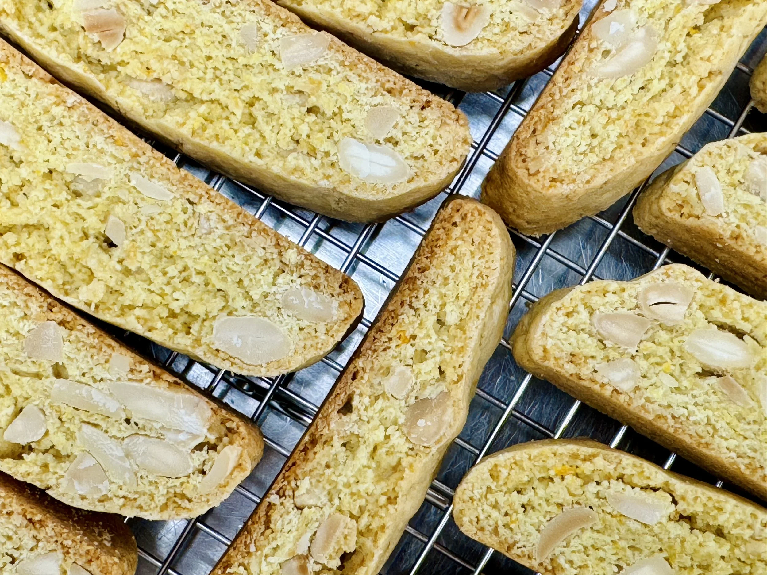 Organic flour and slightly sweet organic medium-ground yellow cornmeal for a delightful crunch. Creamy and rich Kerrygold butter. Sweet and fragrant roasted Marcona almonds. Bright, bold, and juicy organic orange zest.